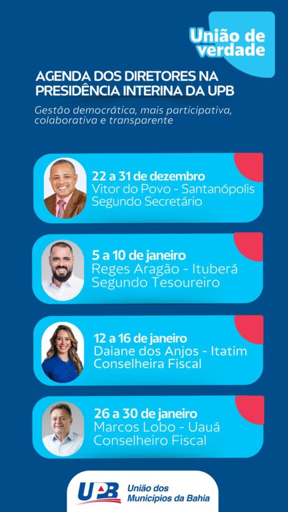 A iniciativa integra o sistema de revezamento entre os membros da diretoria, idealizado pelo presidente da UPB e prefeito de Andaraí, Wilson Cardoso, que tem como fundamento a liderança compartilhada e o fortalecimento do municipalismo baiano por meio da união e da participação ativa dos gestores.