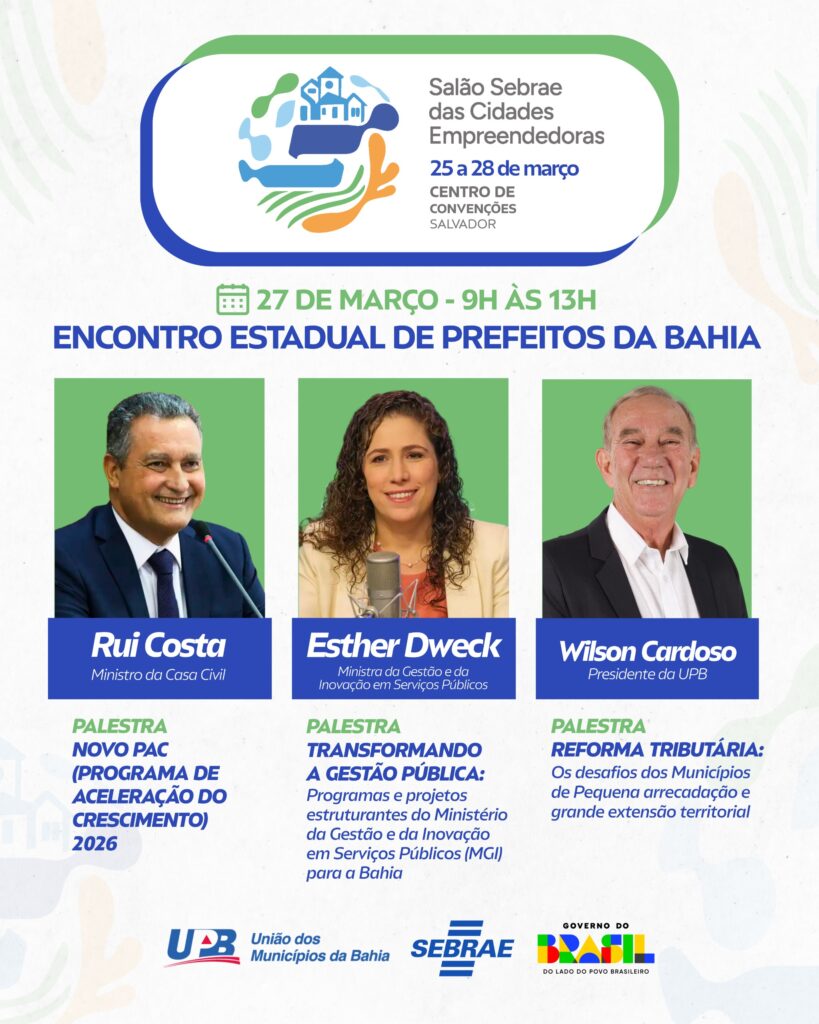 No dia 26 de março, serão realizadas plenárias sobre Gestão e Políticas Públicas, Empreendedorismo na Escola e 20 anos da Lei Geral da Micro e Pequena Empresa (Lei Complementar 123/2006). Já no dia 27, a UPB promove o Encontro Estadual de Prefeitos da Bahia, com a palestra do Ministro da Casa Civil, Rui Costa, sobre investimentos do Novo PAC 2026. A ministra Gestão da Inovação em Serviços Públicos, Esther Dueck, também confirmou presença no encontro e apresentará os programas e projetos para melhorar a gestão de compras públicas nos municípios. O evento trará ainda plenárias voltadas a discutir os desafios dos municípios de pequena arrecadação e grande extensão territorial, além do financiamento do turismo.